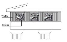 Metopa: Es un elemento que se encuentra en los frisos clásicos, que teniendo forma cuadrada o rectangular, se sitúa entre los triglifos, hallándose decorado con relieves.